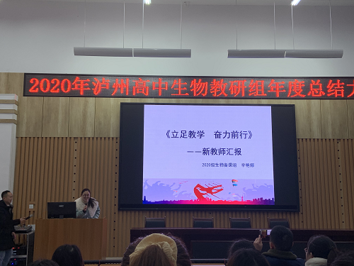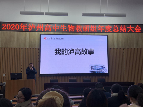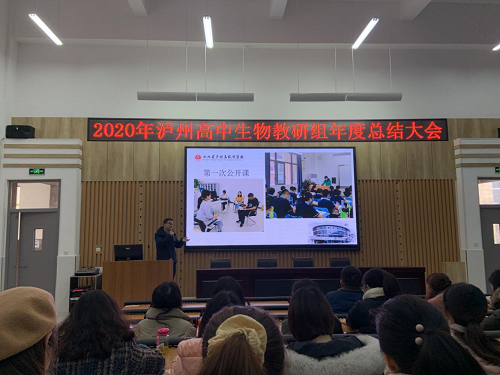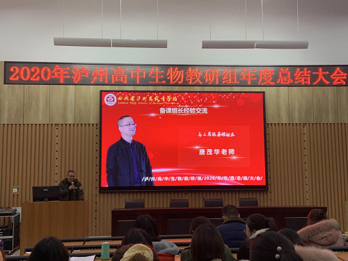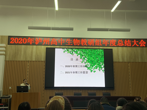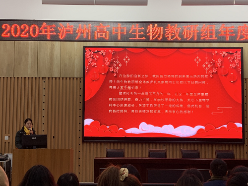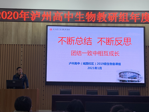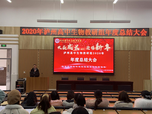 时光如流水,不知不觉中,一学期又结束了。本年度,在学校的正确领导下,在各级分管领导的关心、支持、帮助下,泸高生物教研组各位老师团结协作,尽心尽力,满腔热情,体现了无私奉献的敬业精神,出色完成了学校交给的各项教育教学任务。为了总结本学年的教研工作,也为接下来更好地开展生物教研活动,泸州高中生物教研组于2021年1月18日在泸州高中城西校区崇德楼会议室举行了2020年年度总结大会。本次总结会由陈波老师主持,参会人员:全教研组生物老师,本次会议有五个流程:1、有主持人介绍参会领导;2、青年教师发表成长感悟;3、备课组长经验交流;4、教研组长年度总结;5、幸运抽奖。