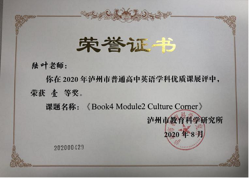 (陆叶老师优质课《Book4 Module2 Culture Corner》荣获市级壹等奖)