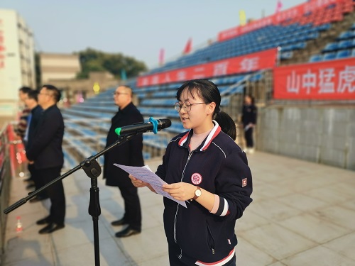 学生代表领誓,全体高三学子举起右拳,怀揣着对美好未来的憧憬,庄严宣誓:挑战人生是我无悔的选择,决胜高考是我不懈的追求。珍惜一百天,让智慧闪光;拼搏一百天,让斗志昂扬;苦战一百天,让青春绽放;奋斗一百天,让梦想飞翔。请父母放心,一定不负您的期盼;请老师放心,一定不负您的心血;请学校放心,一定不负您的厚望!自我调整,身心健康;全力以赴,创造辉煌!六月高考,我必成功!