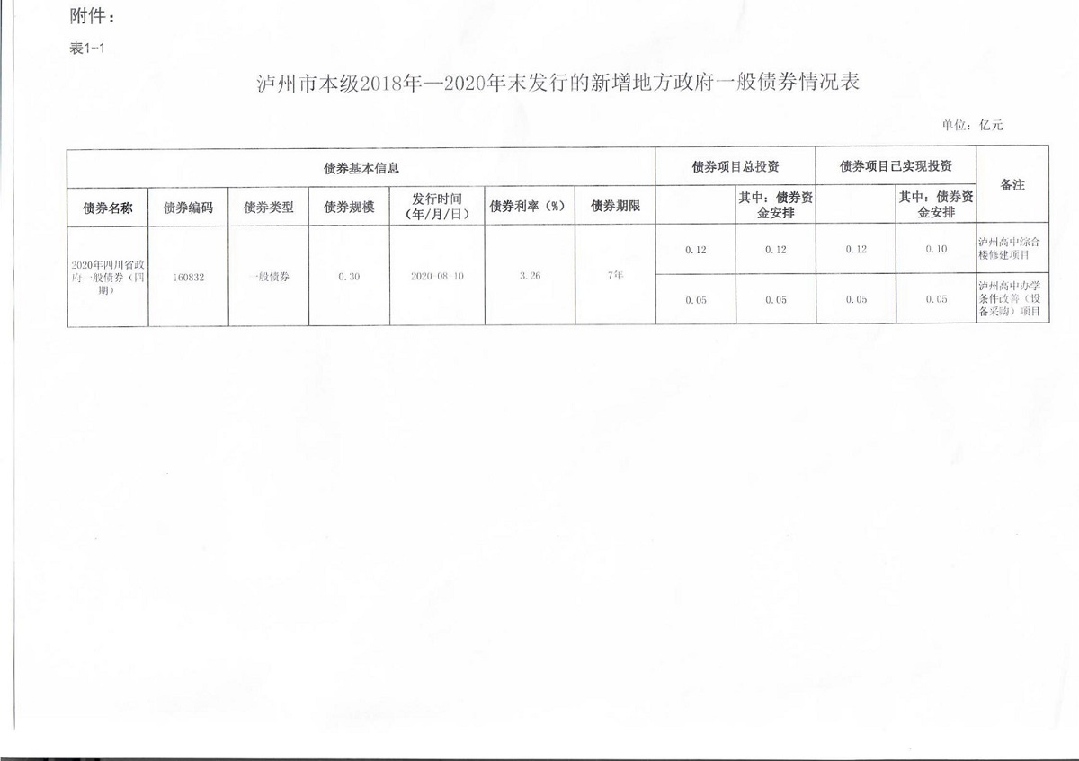 泸州市本级2018-2020年末发行的新增地方政府一般债券情况表