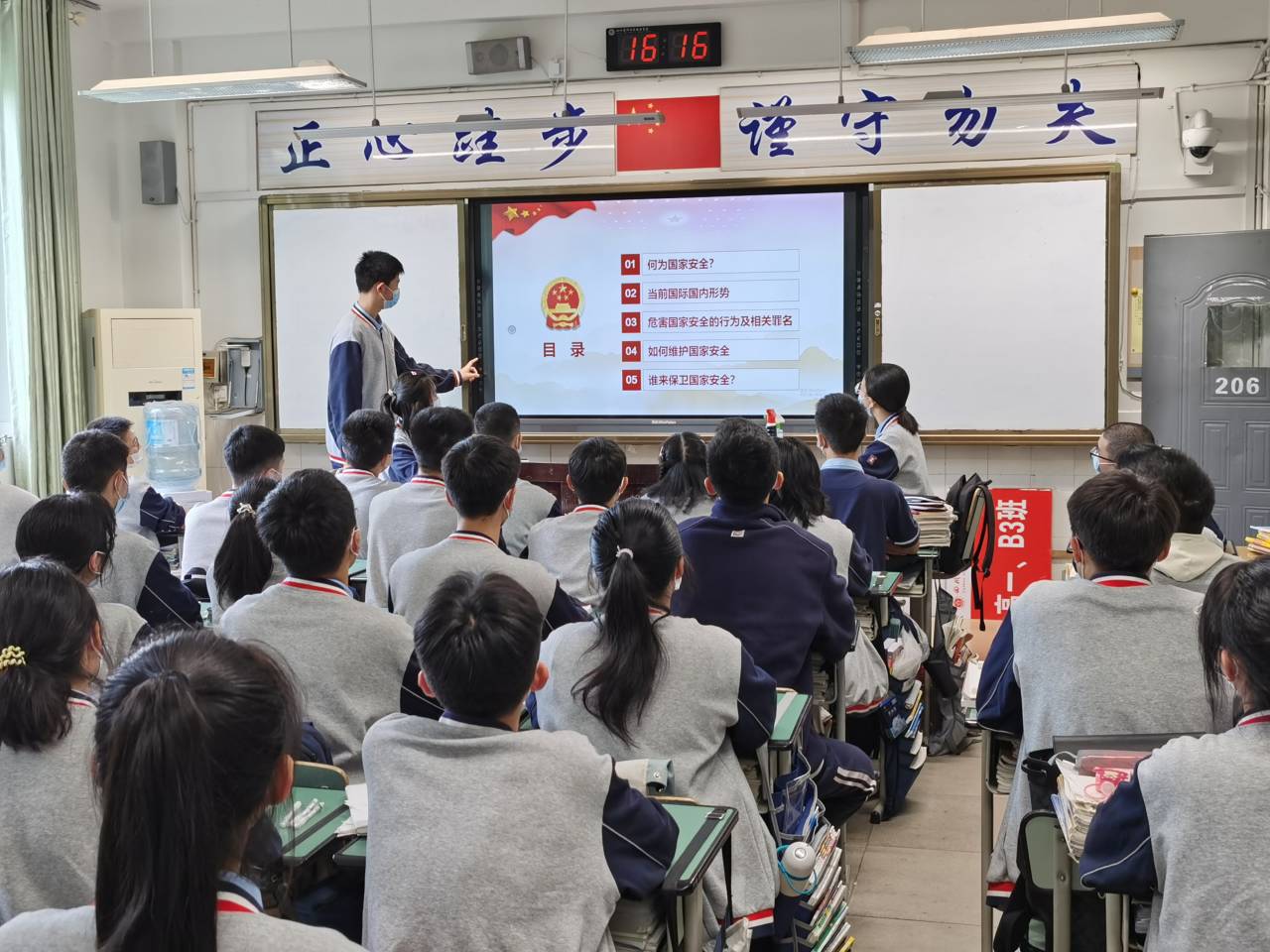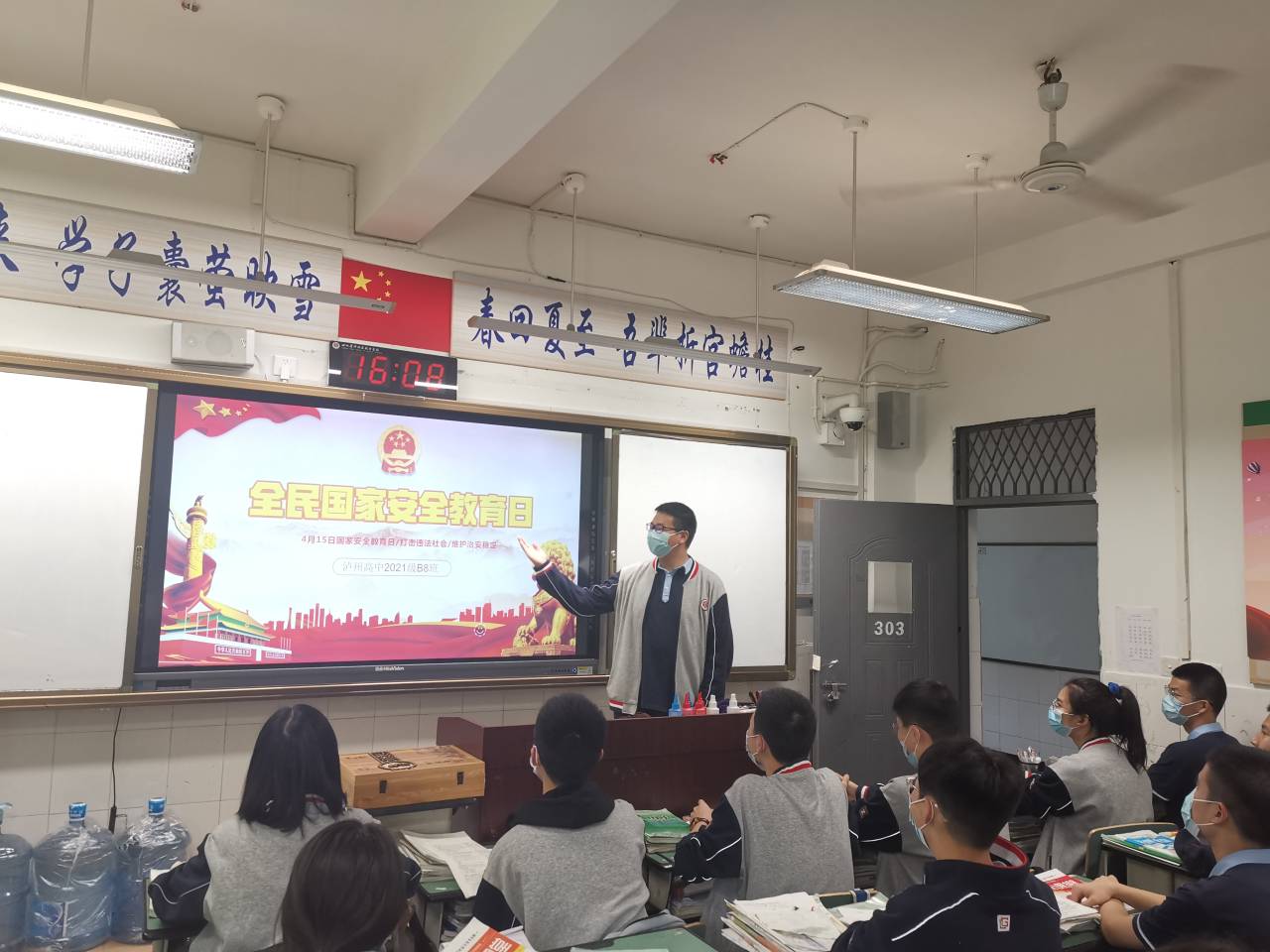 积极探索安全教育新模式,将国家安全教育融入课堂教育。我校思政教师杨永成在课堂上围绕“大国担当”“疫情大考”“风雨同舟”等课题开展系列宣讲,生动讲述疫情防控斗争中展现的中国共产党领导和中国特色社会主义制度的显著优势,引导学生将总体国家安全观贯穿抗疫全过程,提升维护国家安全的自觉性和主动性。