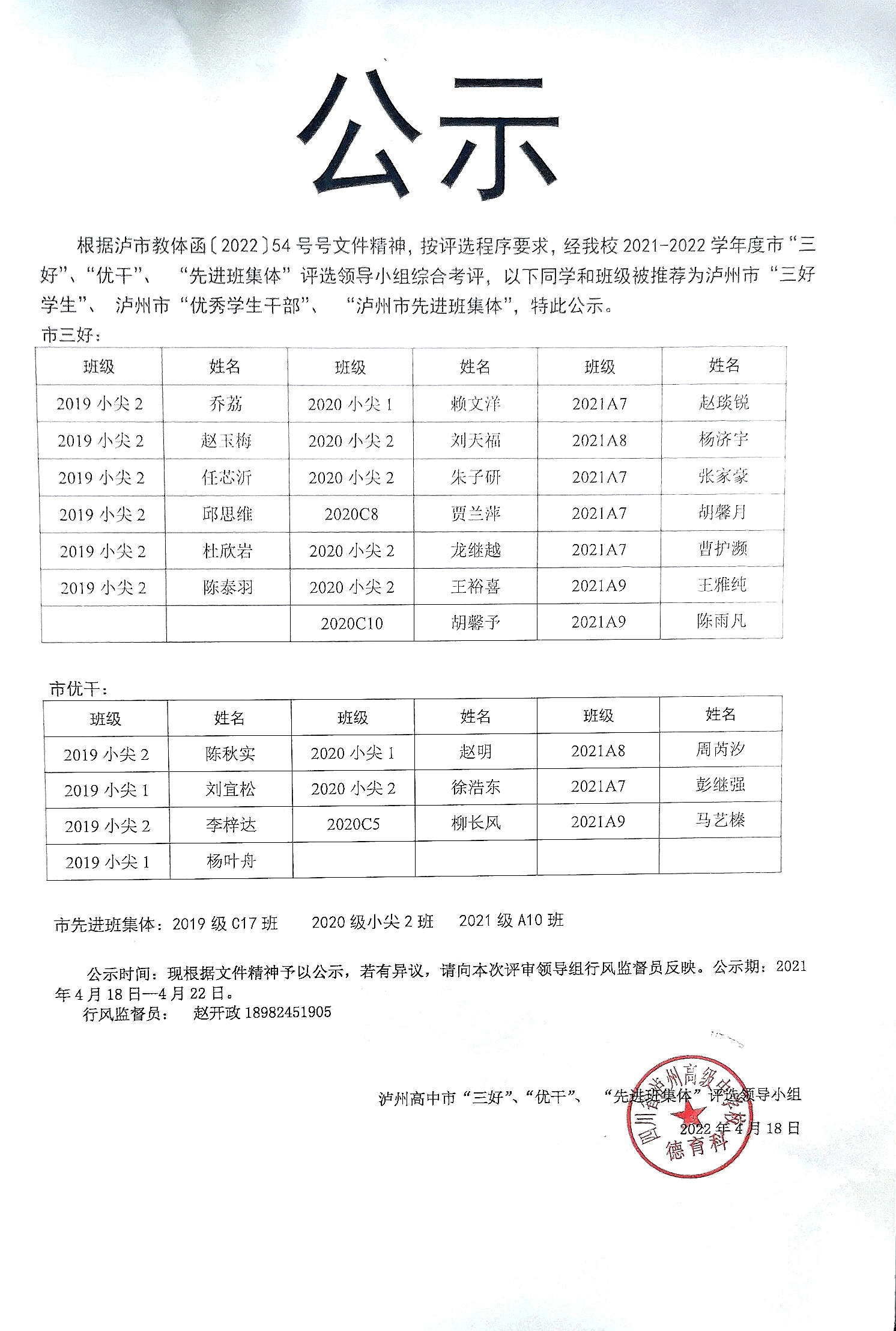 泸州高中关于2021-2022学年度市“三好”、“优干”、 “先进班集体”的公示