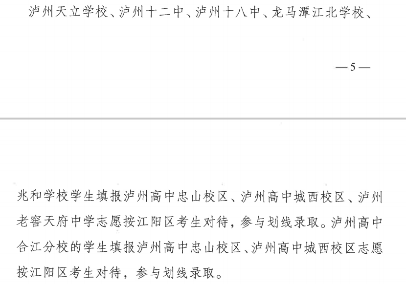 二、龙马潭天立学校、龙马潭泸州十二中、龙马潭泸州十八中、龙马潭江北学校(淡思学校)、龙马潭兆和学校、泸州高中合江分校学生填报泸州高中忠山校区和城西校区志愿按江阳区考生对待,参与划线录取。