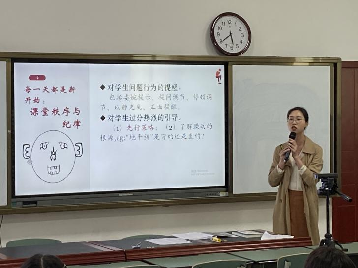 本次会议有新教师读书分享、学校领导培训、近期活动通报安排三项议程。 首先由2021级新分教师董静怡分享《你的第一年(新教师如何生存发展)》这本书的读后感。董老师主要从课堂管理这个角度进行了分享,其中结合自身的教学方式方法和教学实例幽默的给大家分享了课堂规则、课堂纪律、师生关系、课堂时间管理和教学内容管理五个维度,让大家感悟颇深。