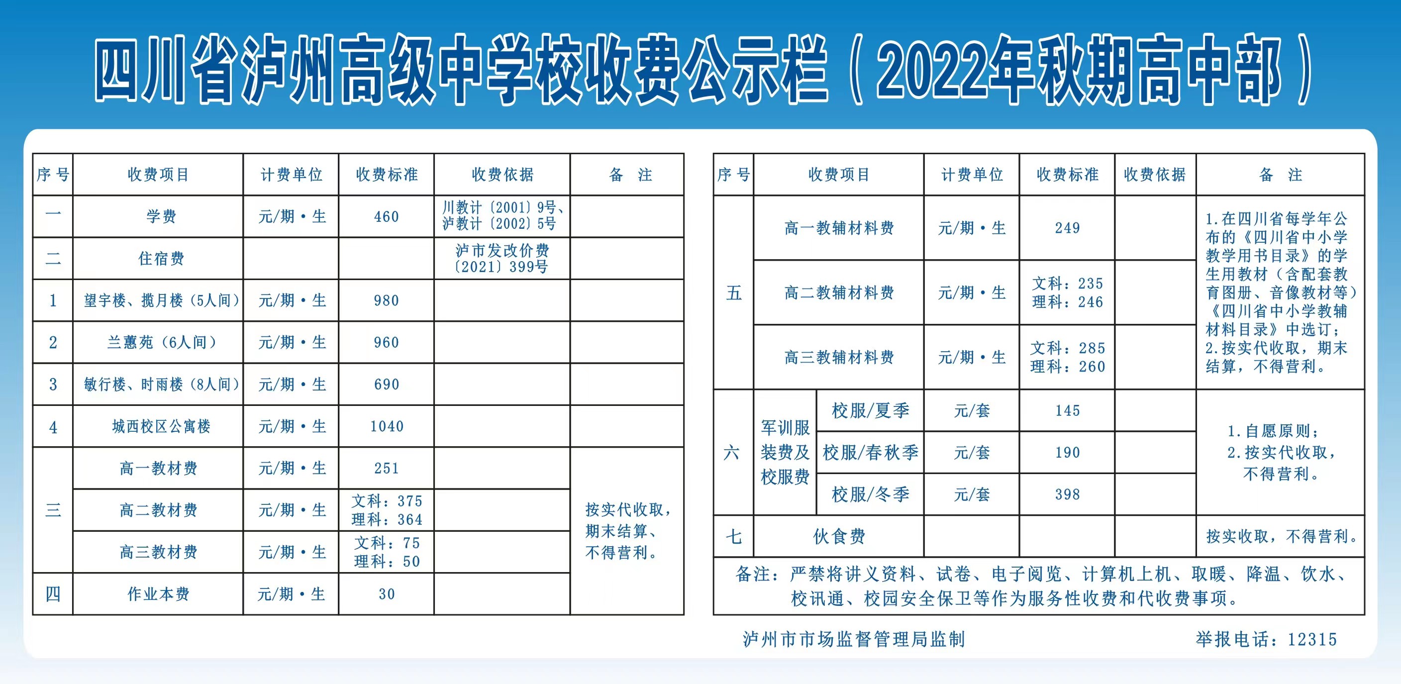 泸州高中收费公示(2022年秋期高中部)