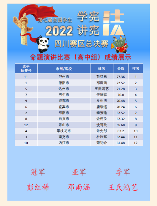 在第七届全国学生“学宪法、讲宪法”四川赛区总决赛中,泸州高中2021级A6班彭红稀同学代表泸州市(泸州赛区第一名)经过主题、命题两轮演讲获全省第一名,将代表四川省参加全国的比赛。特此向彭红稀同学、指导教师龙小海和班主任张自会老师表示热烈祝贺!
