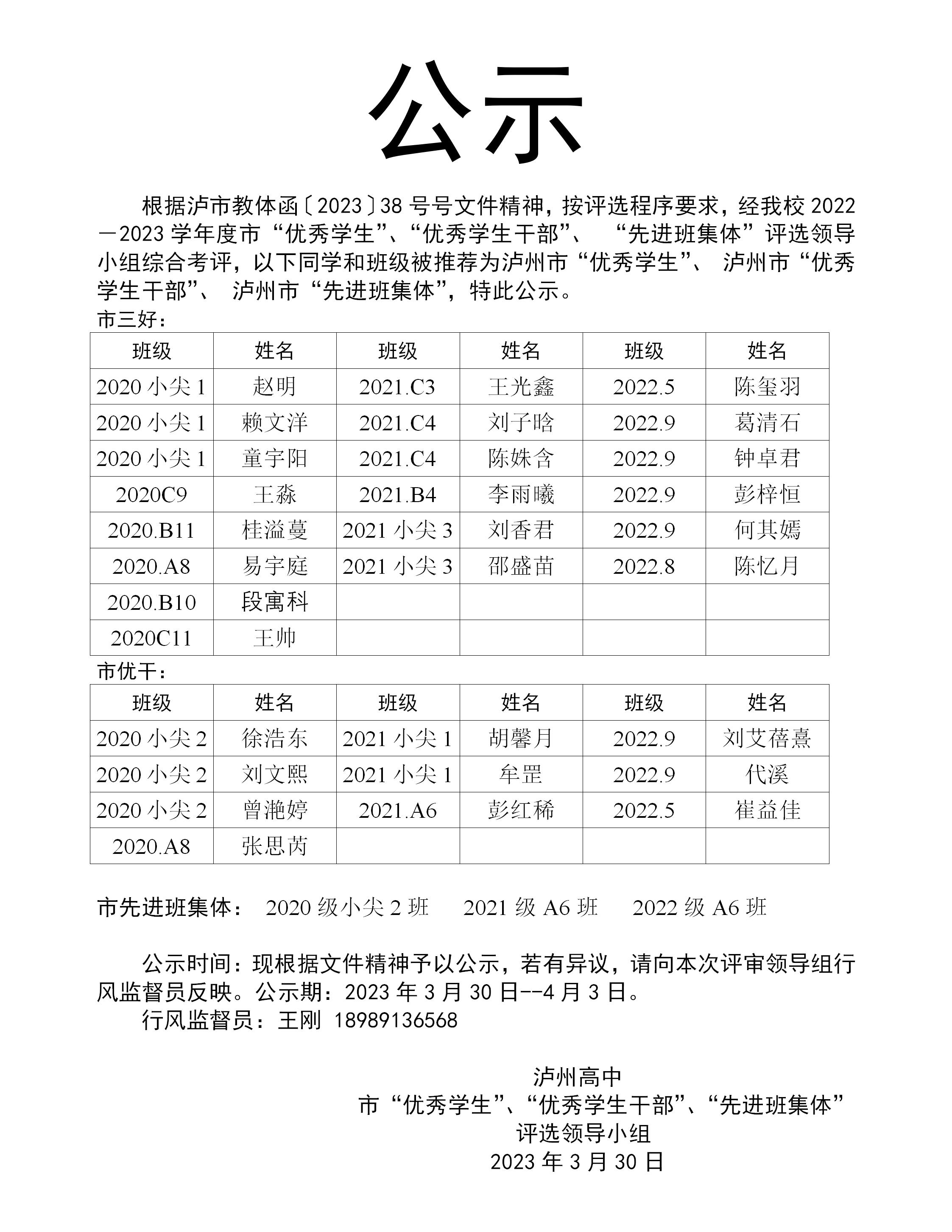泸州高中关于2022-2023学年度市“优秀学生”、“优秀学生干部”、 “先进班集体”推荐对象的公示