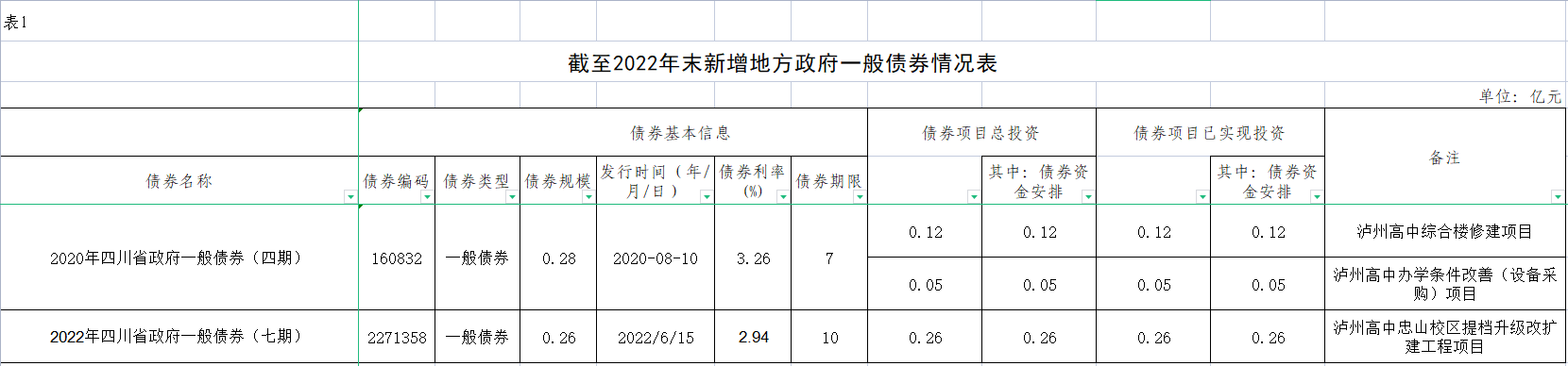 泸州高中截至2022年末新增地方一般债券情况表