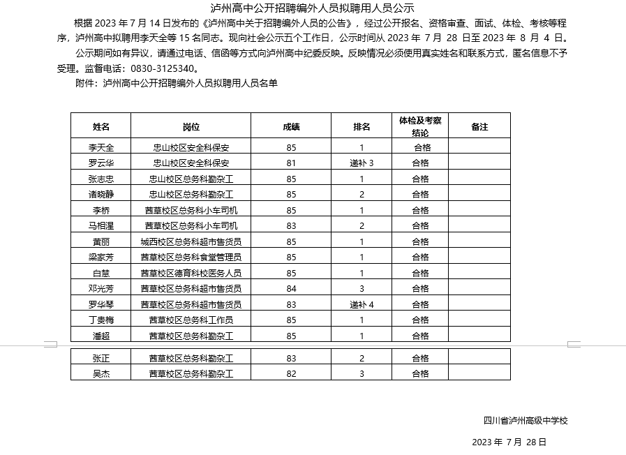 泸州高中公开招聘编外人员拟聘用人员公示
