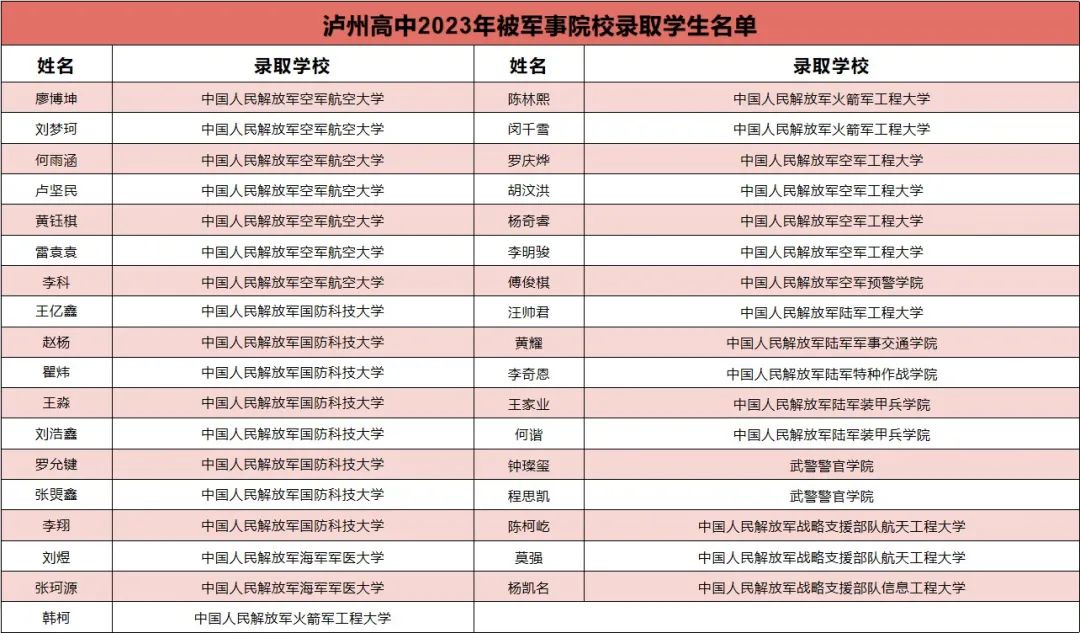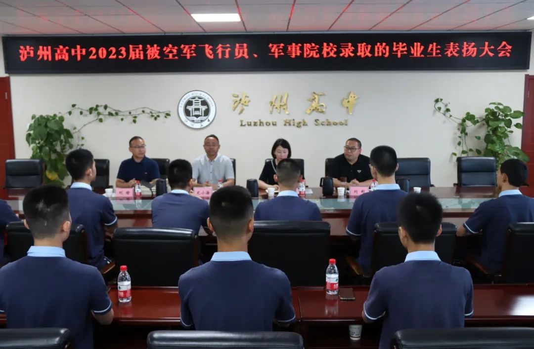 泸州高中建校近七十年,始终坚持为党育人、为国育才的初心,落实立德树人根本任务,实施五育融合,每年为军事院校输送学生30余人。我校先后为空军输送了25名飞行员。2018年2名同班同学双双考入空军,均获得空军航空大学和清华大学双学籍;今年朱英老师班培养出了三名空军飞行员,被老师们誉为“一班送三飞”。
