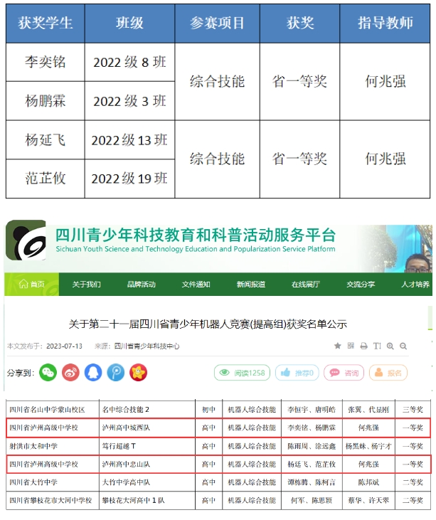 四川省泸州高级中学校城西校区李奕铭、杨鹏霖、杨延飞、范芷攸4位同学在第二十届四川省青少年机器人竞赛(提高组)综合技能赛项中纷纷获得省一等奖的成绩。