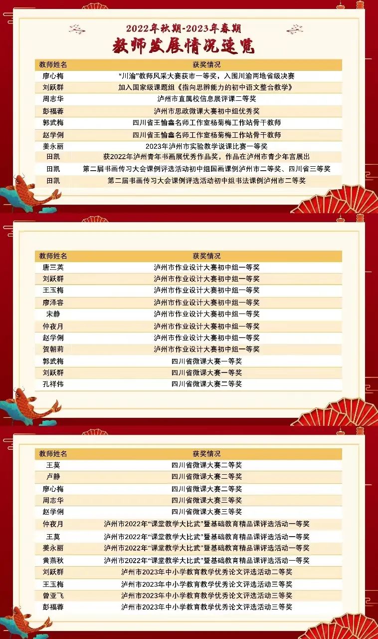 一滴滴汗水伴随成长,一份份喜悦接踵而至。这一年来,泸高初中部教师脚踏实地,潜心研修。三尺讲台,四季耕耘,他们用心用情做教育,收获了累累硕果。