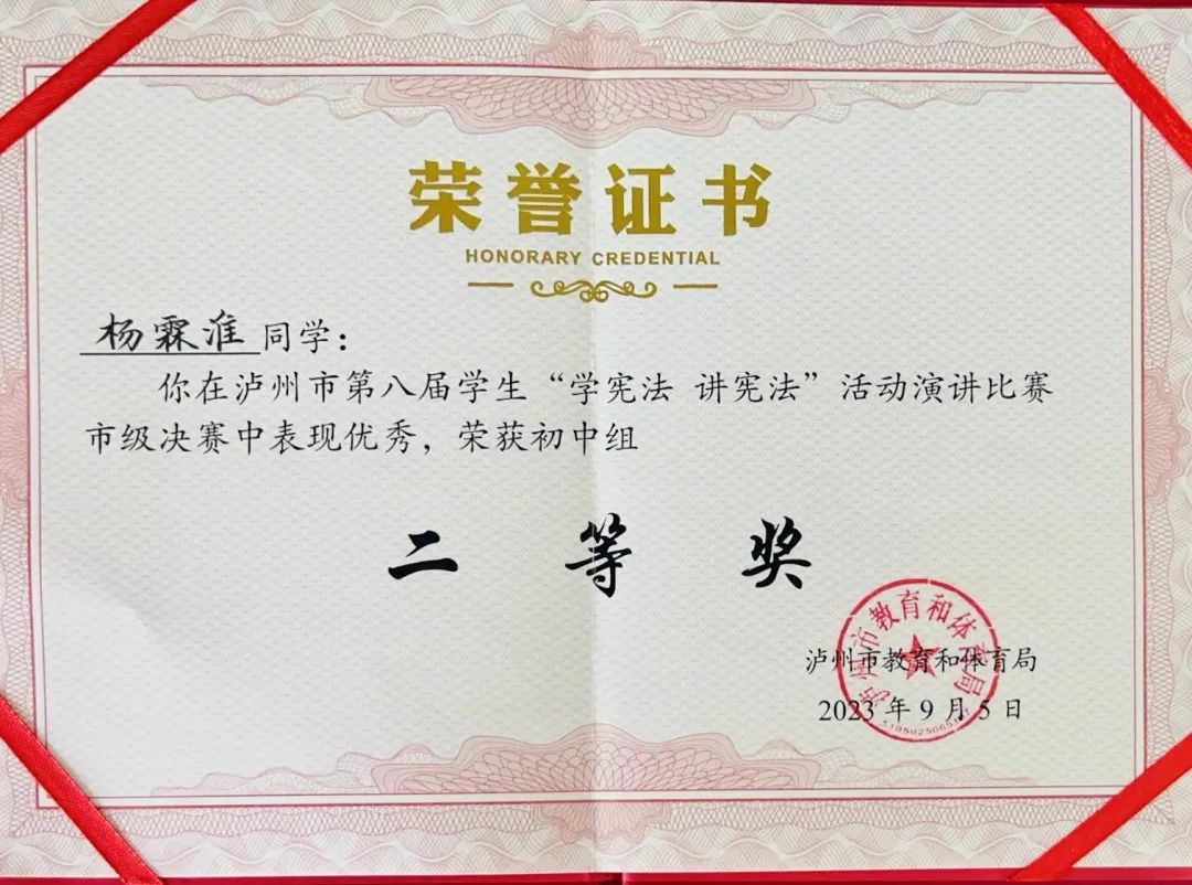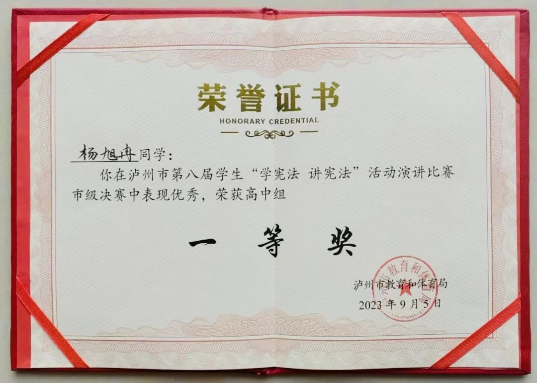 泸州高中杨旭冉同学成功斩获泸州市第八届学生“学宪法 讲宪法”演讲比赛市级决赛(高中组)一等奖第一名。