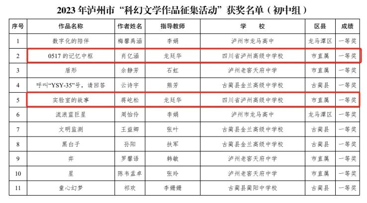 近日,在2023 年泸州市“科幻文学作品征集活动”中,泸州高中肖亿涵同学的作品《0517 的记忆中枢》和蒋屹松同学的作品《实验室的故事》荣获一等奖。