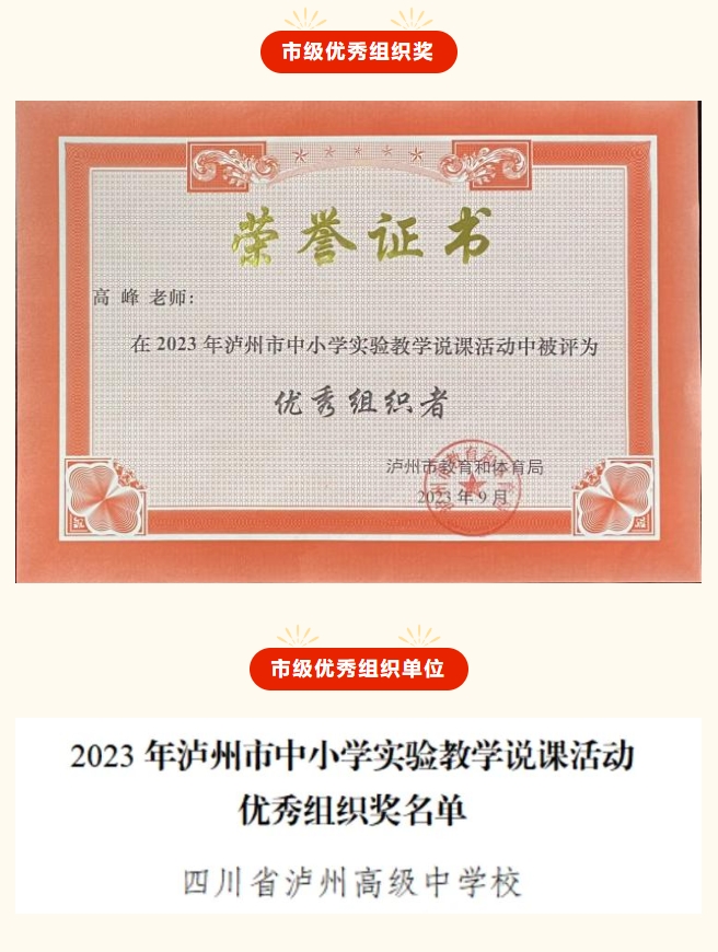 在2023年四川省中小学实验教学说课活动中,泸州高中获得省级奖项3个、市级奖项8个,在全市中小学中继续领先水平,且稳中有升!