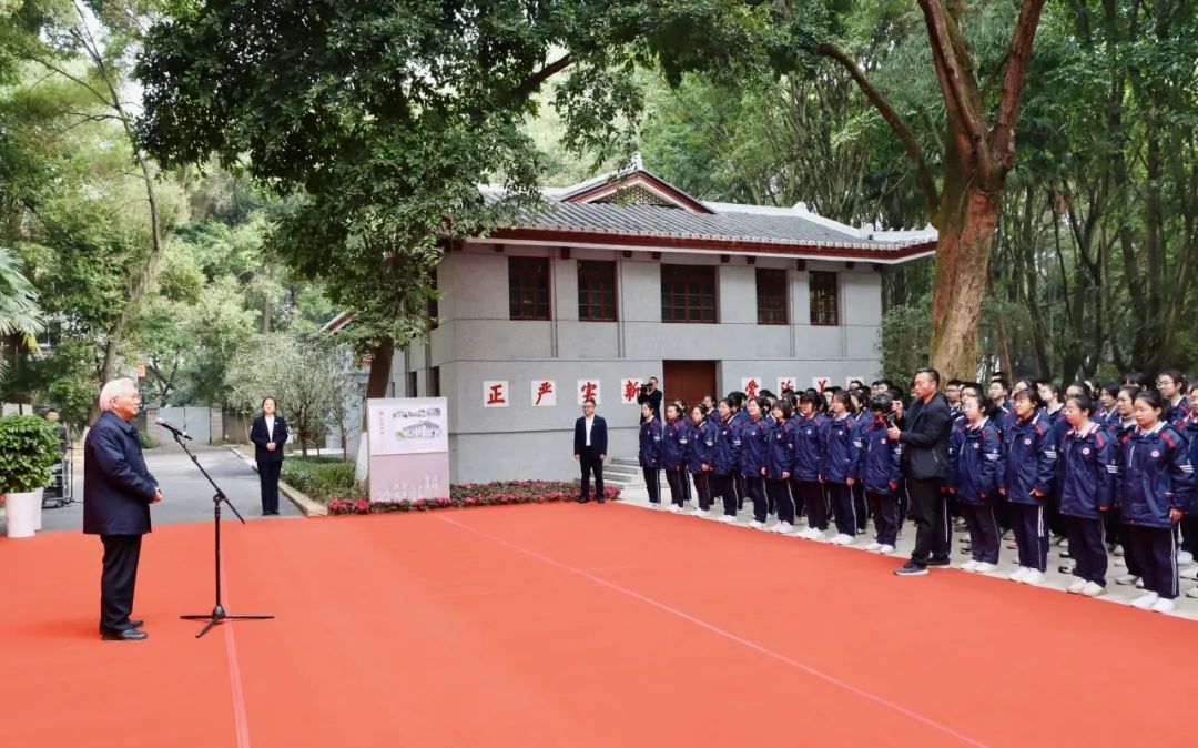 ▲张强院士与学校党委书记、校长陈云超一起为五四新楼揭牌,标志着泸州高中70周年办学成果展正式启动。