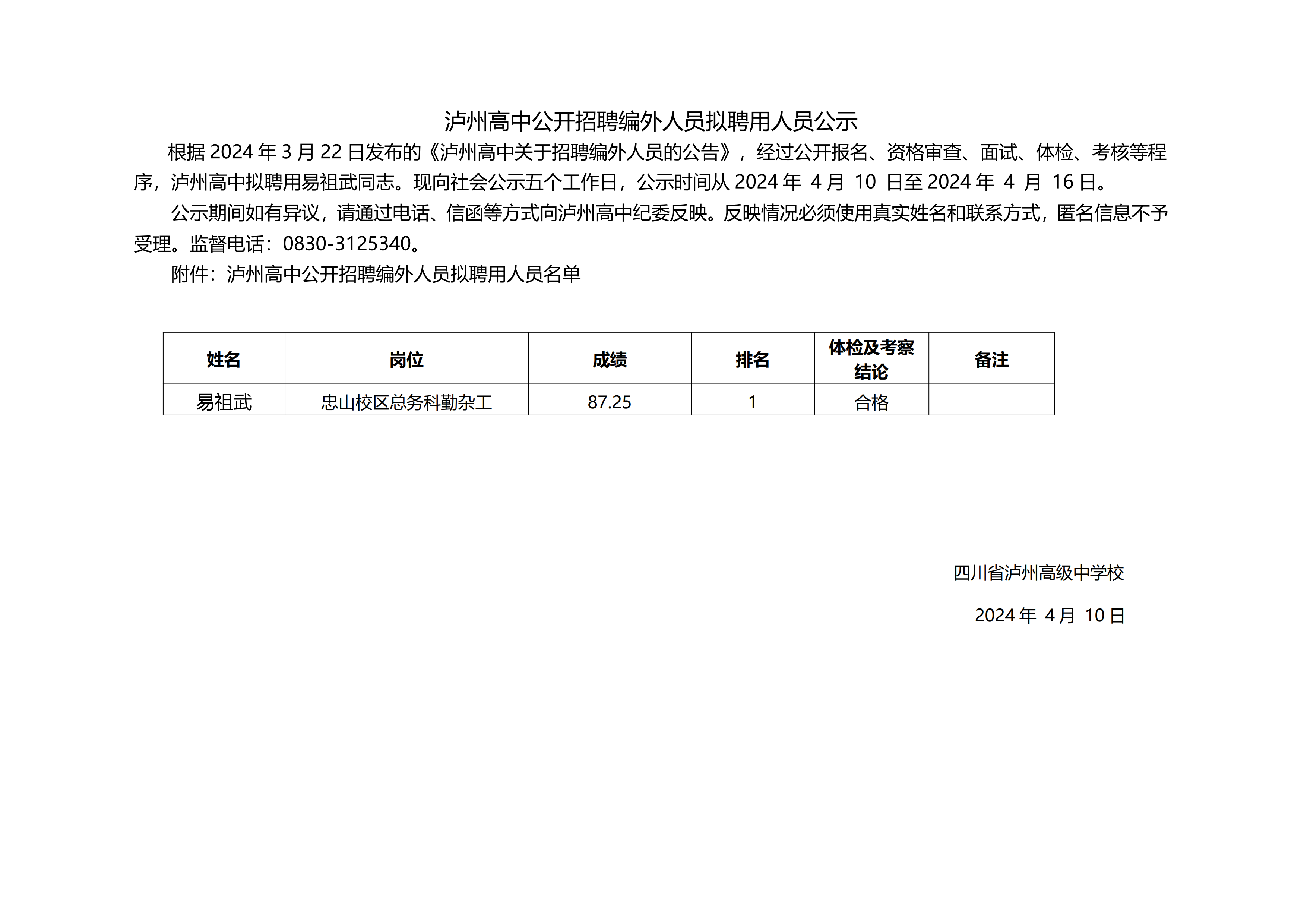 泸州高中公开招聘编外人员拟聘用人员公示