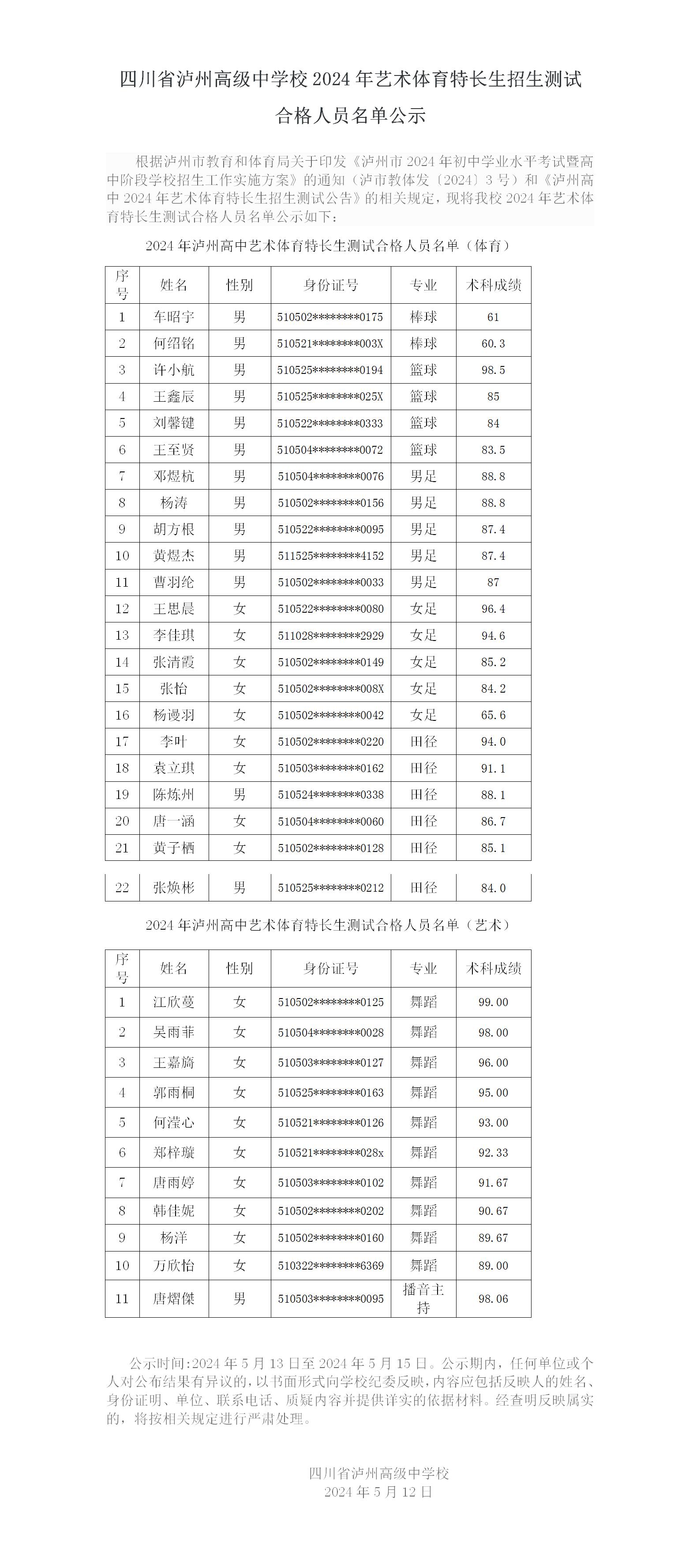 四川省泸州高级中学校2024年艺术体育特长生招生测试 合格人员名单公示