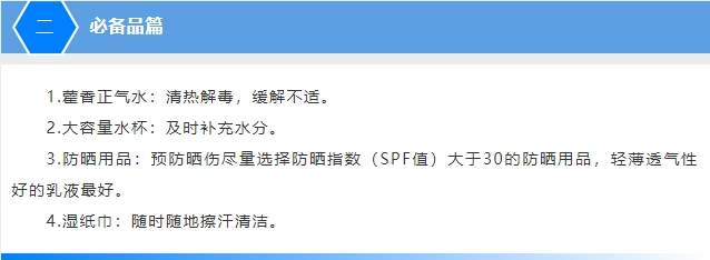 军训来临,夏日炎炎。高温是对同学们身心的双重考验,为了健康与安全,防暑尤为重要。学校将根据天气灵活安排军训课程,同时准备了十滴水等防暑中成药,供师生免费取用,校医团队全程待命,学校食堂也准备了营养均衡的膳食,为新生军训提供好后勤保障。下面这份军训防暑指南供家长同学参考,预祝新生度过一个健康、愉快的军训期!
