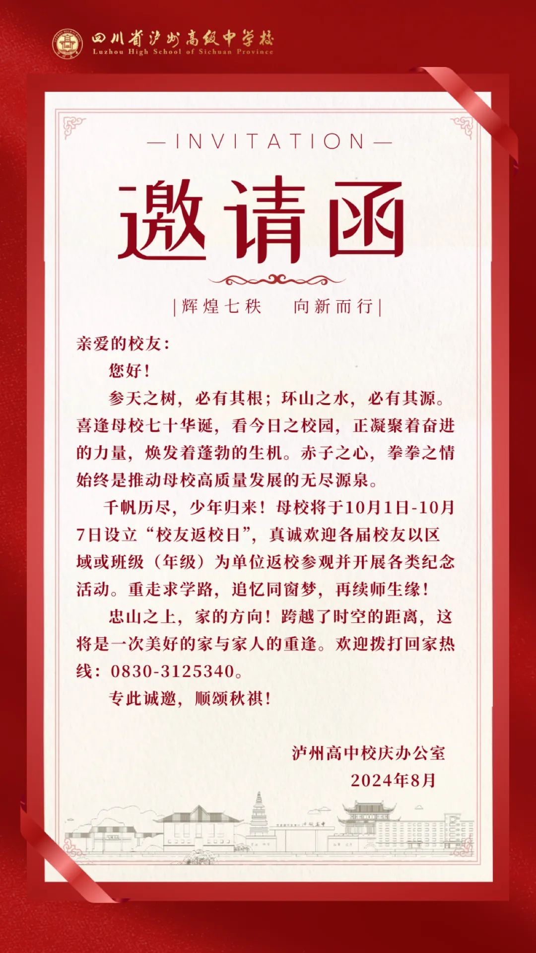 泸州高中建校70周年校庆“校友返校日”邀请函
