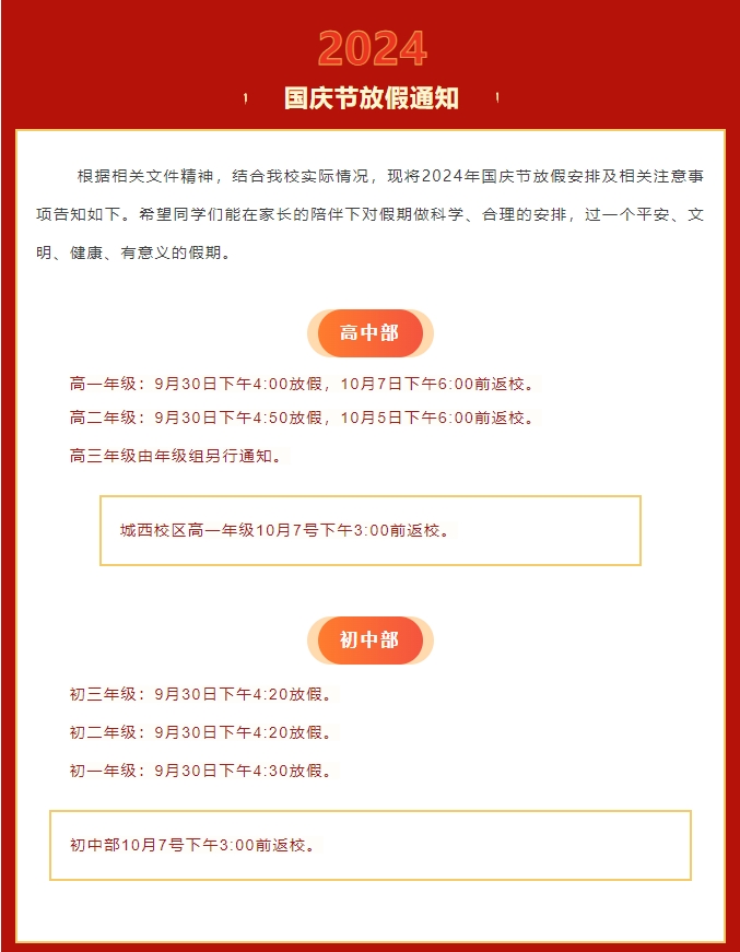 泸州高中2024年国庆节放假通知