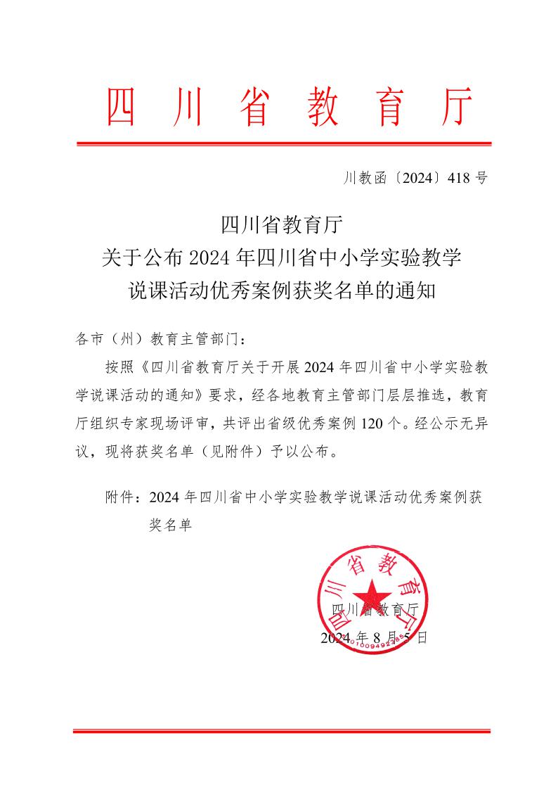 此次活动中,李济丹老师的作品《高尔顿板助力<二项分布的应用>》一路披荆斩棘、脱颖而出,在2024年泸州市中小学实验教学说课活动中荣获一等奖第一名,在2024年四川省中小学实验教学说课活动中入选优秀案例,最终入选第十届全国中小学实验教学说课活动现场展示案例名单。