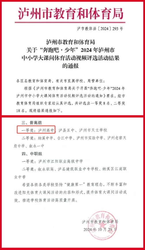 近日,泸州高中在“奔跑吧·少年”2024年泸州市中小学大课间体育活动视频评选活动中,荣获普高组一等奖第一名,并将代表泸州市参加四川省第三届中小学校大课间体育活动视频评选。