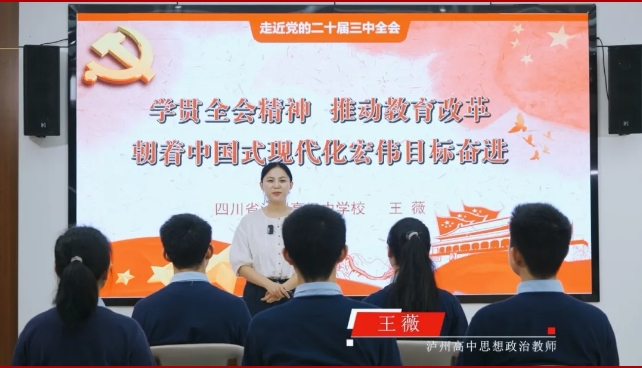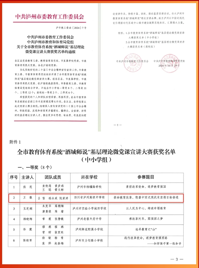 近日,在中共泸州市委教育工作委员会、中共泸州市教育和体育局党组组织开展的全市教育体育系统“酒城师说”基层理论微党课宣讲大赛中,泸州高中教师王薇、杨永成、阮家涛等组成的参赛团队报送的微党课《推动教育改革,朝着中国式现代化宏伟目标奋进》荣获一等奖。