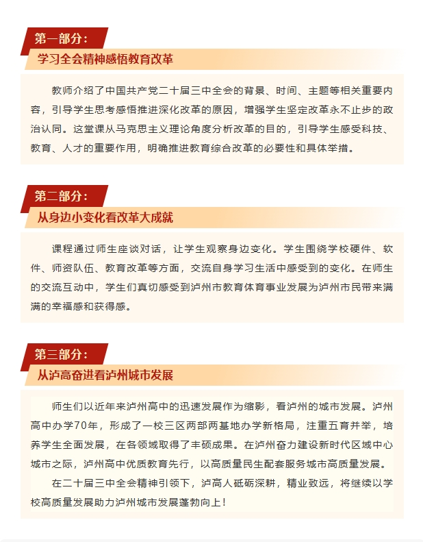 获奖不是终点,党课永不停讲。泸州高中将以此次宣讲大赛为契机,持续深入宣传宣讲党的二十届三中全会精神,推出更多有思想、有品质、有温度的理论宣讲作品,为党员群众送上更多优质党课。