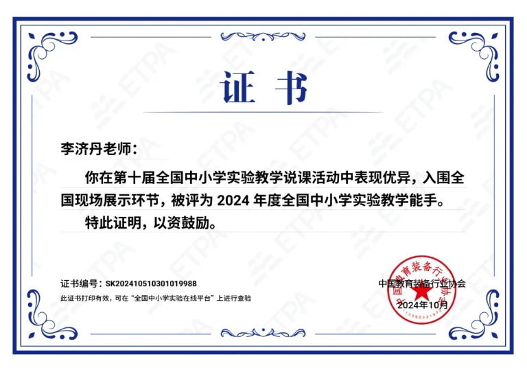 李济丹老师凭借精妙的实验设计,精心的优化打磨,精湛的教技展示,一举斩获本次实验说课全国最高奖项“2024年度全国中小学实验教学能手”荣誉称号。同时,主要参与人员兼指导教师朱先华老师和肖上林老师一并获得“2024年度全国中小学实验教学能手”称号。