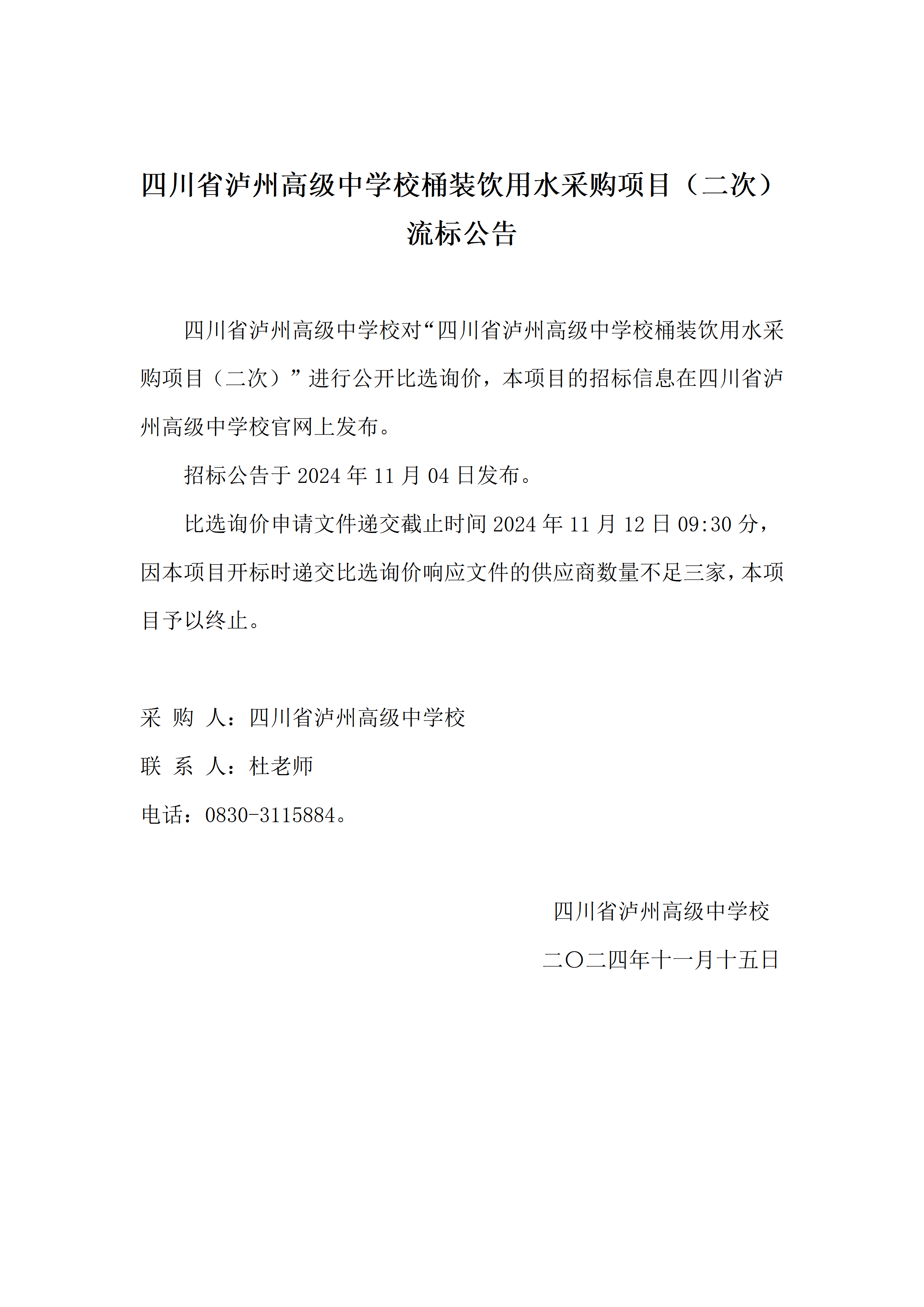 四川省泸州高级中学校桶装饮用水采购项目(二次)流标公告