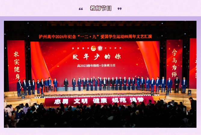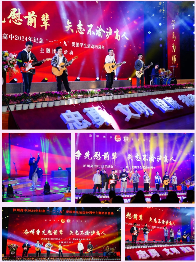 12月9日、10日晚,忠山校区师生齐聚红樟展演中心,隆重举行泸州高中2024年纪念“一二·九”爱国学生运动主题团日系列活动。团市委副书记曹真玮,泸州高中党委书记、校长陈云超,校领导明安田、刘春梅、刘春宇、李奎、翟晓根等出席此次活动。