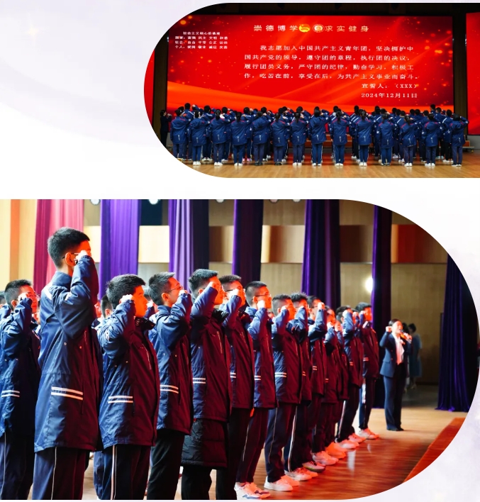 在陈丽娜老师的带领下,本批次新入团团员面向团旗,握紧右拳,大声说出中国共产主义青年团誓词。