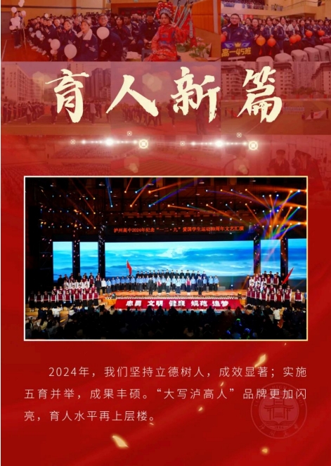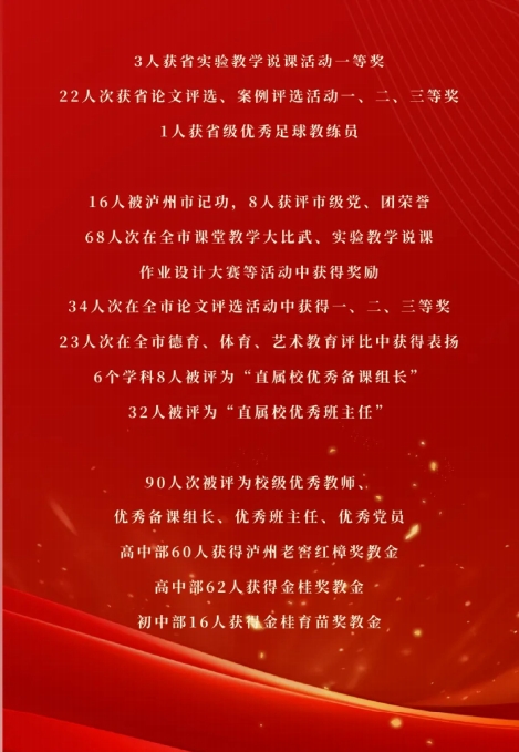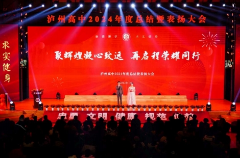 2025年1月18日,泸州高中召开2024年度总结暨表扬大会。全体教职员工齐聚忠山校区红樟展演中心,共同回顾学校2024年发展成就,隆重表扬为学校发展作出突出贡献的教职员工,展望2025年美好愿景,喜迎乙巳蛇年新春。