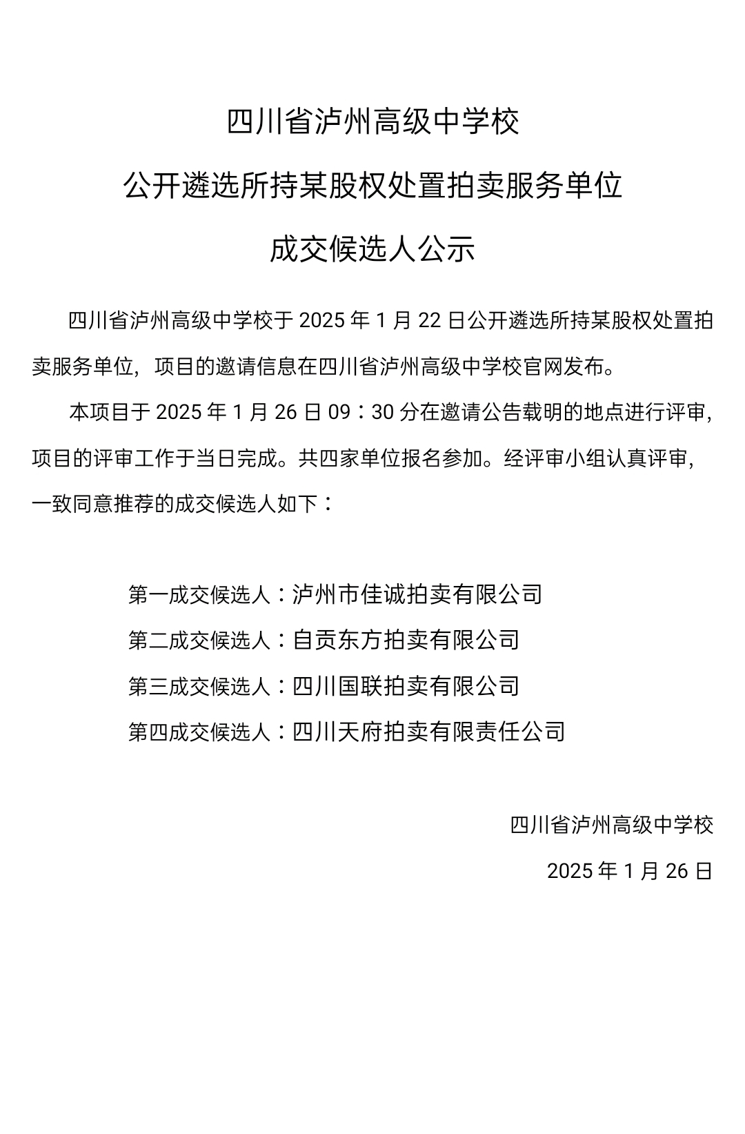 四川省泸州高级中学校公开遴选所持某股权处置拍卖服务单位成交候选人公示