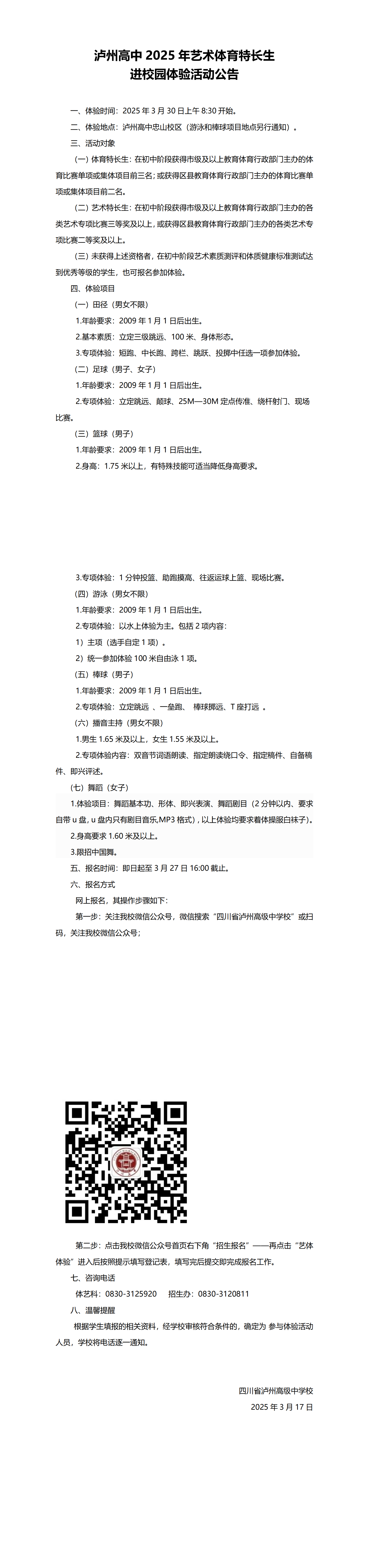 泸州高中2025年艺术体育特长生进校园体验活动公告