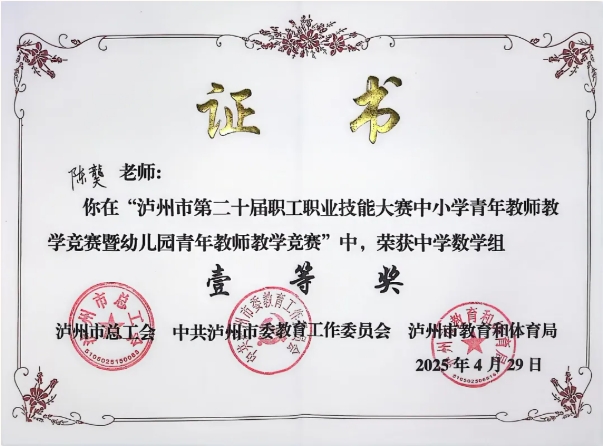 泸州高中初中部陈龑老师,在刚刚结束的“泸州市第二十届职工职业技能大赛中小学青年教师教学竞赛暨幼儿园青年教师教学竞赛”活动中,荣获一等奖第一名!