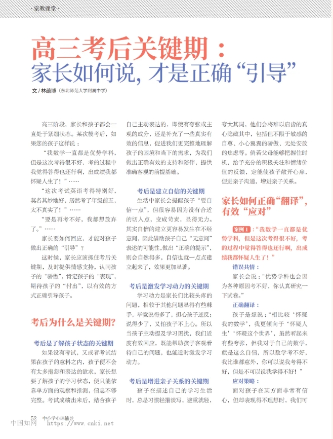 三位家长一致认为:与孩子谈论成绩时,应正确看待成绩,建立和谐亲子关系、与孩子共同面对学习压力。对此,家校共育办公室韩雨纯老师向家长朋友们特别推荐《家教课堂》杂志上刊载的《高三考后关键期 :家长如何说,才是正确“引导”》,希望能给家长朋友们提供专业的理论指导。