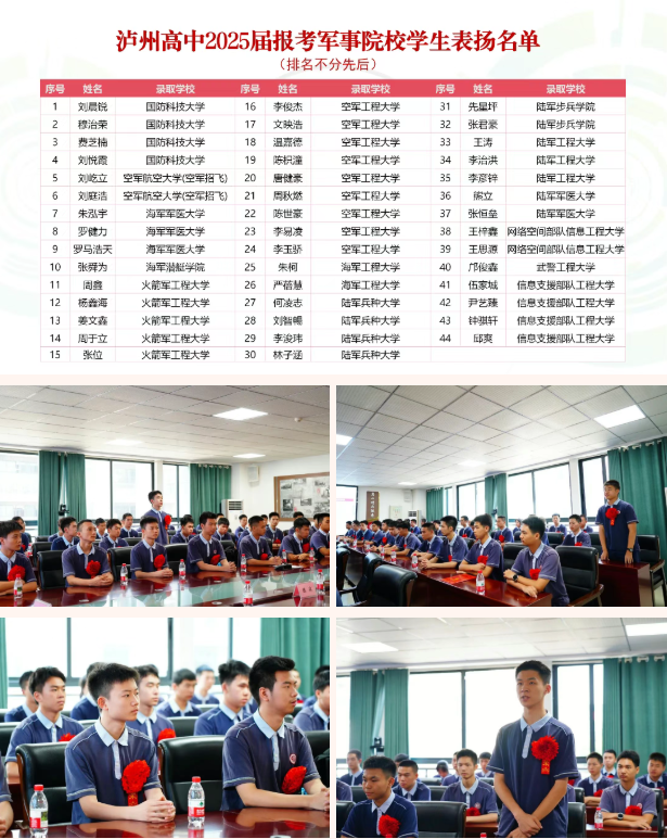 作为育人主阵地,泸州高中始终将国防教育与爱国主义教育深度融合,着力培养学生责任感与使命感。学校通过举办国防知识讲座、举行军事院校录取学生表扬大会、开展军事拓展训练等一系列活动,不断激发学生对国防事业的热爱与向往,激励着更多泸高学子投身国防事业,为实现中华民族的伟大复兴贡献力量。