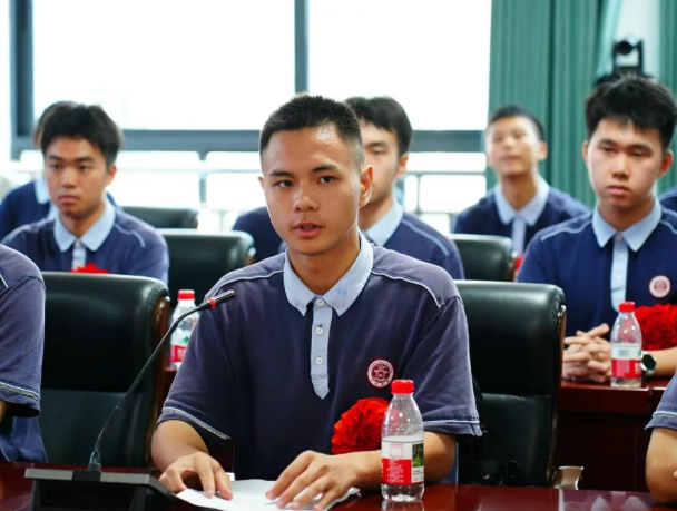 高2022届忠山校区B7班的穆治荣同学,作为学生代表发言。他以一副对联激励同学们:“携笔从戎,报国得门,敢立不世之功;横刀立马,杀敌有路,当彰先烈之风——参军光荣。”他话语中的真挚情感,以及投身国防事业的坚定决心,感染了与会的每一个人,赢得了现场师生的热烈掌声。