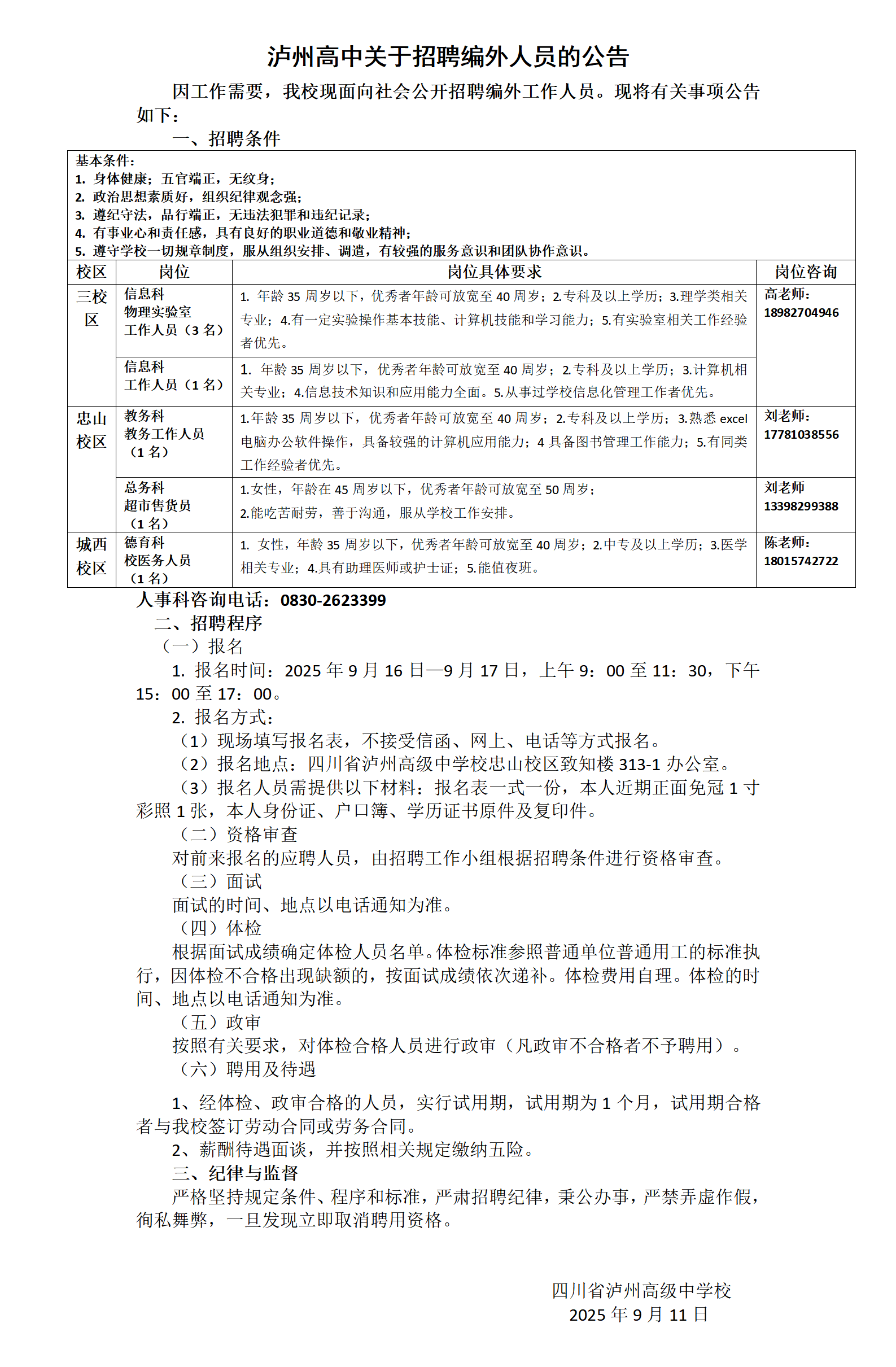 泸州高中关于招聘编外人员的公告