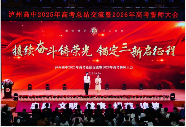 10月29日下午,泸州高中以“接续奋斗铸荣光 锚定三新启征程”为主题,召开2025年高考总结交流暨2026年高考誓师大会。学校校级领导、中层干部及高2022、2023级全体教师齐聚会场,共享新高考改革背景下首届高考成果,总结备考经验,擘画2026年高考备战新蓝图。