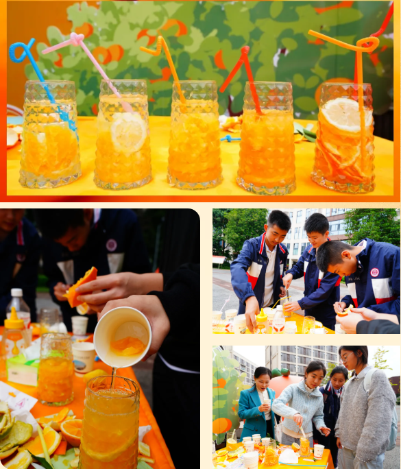 在双馨广场,同学们化身“美食创客”,专注投入蜂蜜橘子茶的制作——去皮、剥瓣、去核、冲泡,有条不紊的协作里,青涩的果实褪去生涩,与温润的蜂蜜交融出醇厚香气。