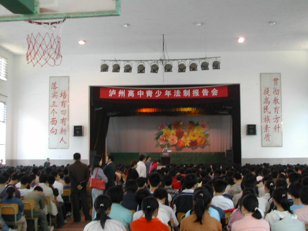 2005年4月19日下午,泸州高中邀请泸州市法建办副主任、泸州市普法讲师团秘书长陈祖琳到校为高一年级学生作法制报告。报告的题目是《学法、守法、用法,做新世纪合格的接班人》。报告从宪法讲起,辅之以五个具体案例,报告深动活泼,迎得同学们阵阵掌声。陈主任引用五个案例《两个学生为了抢钱,用铁锒头砸死网吧老板》、《校园内成立的黑色110》、《因泡网吧杀死父亲、奶奶事件》、《云南大学马加爵杀人事件》、《一名少年犯的忏悔》,充分阐述了学习法律的重要意义,要求同学们在提高学习成绩的同时,要不断加强自身素质的提高,不能忽视心理素质的提高,思想素质的培养,各方面能力的提高。要加强法律知识的学习,做一个知法、守法、用法的新世纪的合格的建设者和接班人。