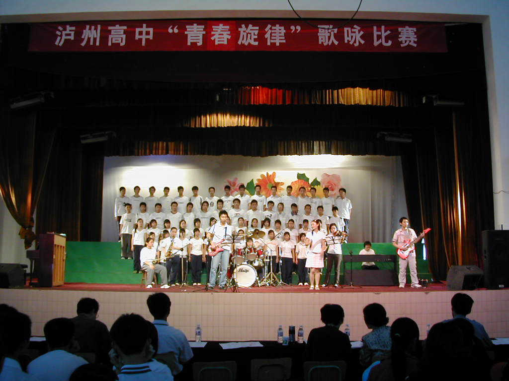 学们学习生活,陶怡情操,提高素质,促进学生全面发展,5月24日下午,泸州高中在学校体育馆举行高一、高二年级“青春旋律”歌咏比赛,比赛以班为单位进合唱。在正式比赛之前,学生“凝神乐坊”乐队首先助兴演出,架子鼓、萨克斯、二胡、电子琴、吉它、佩斯齐鸣,奏出美妙的音符,一曲男女声二重唱《让我们荡起双桨》顿时将演出推向高潮。正式比赛,各班着装统一,队形整齐,同学们精神饱满,指挥抑扬顿挫,歌声悦耳嘹亮。有的班同学拿着鲜花,有的手持彩球,有的捧着心形彩纸,有的托着点亮的蜡烛,一曲曲《明天会更好》、《友谊地久天长》、《歌唱祖国》、《让世界充满爱》、《祝你平安》等名曲在体育馆内久久回荡。近5个小时的演出充满青春激情,充满欢声笑语,整场歌咏赛十分精彩,让美丽的泸高校园充满歌声,充满欢乐。 比赛结果: