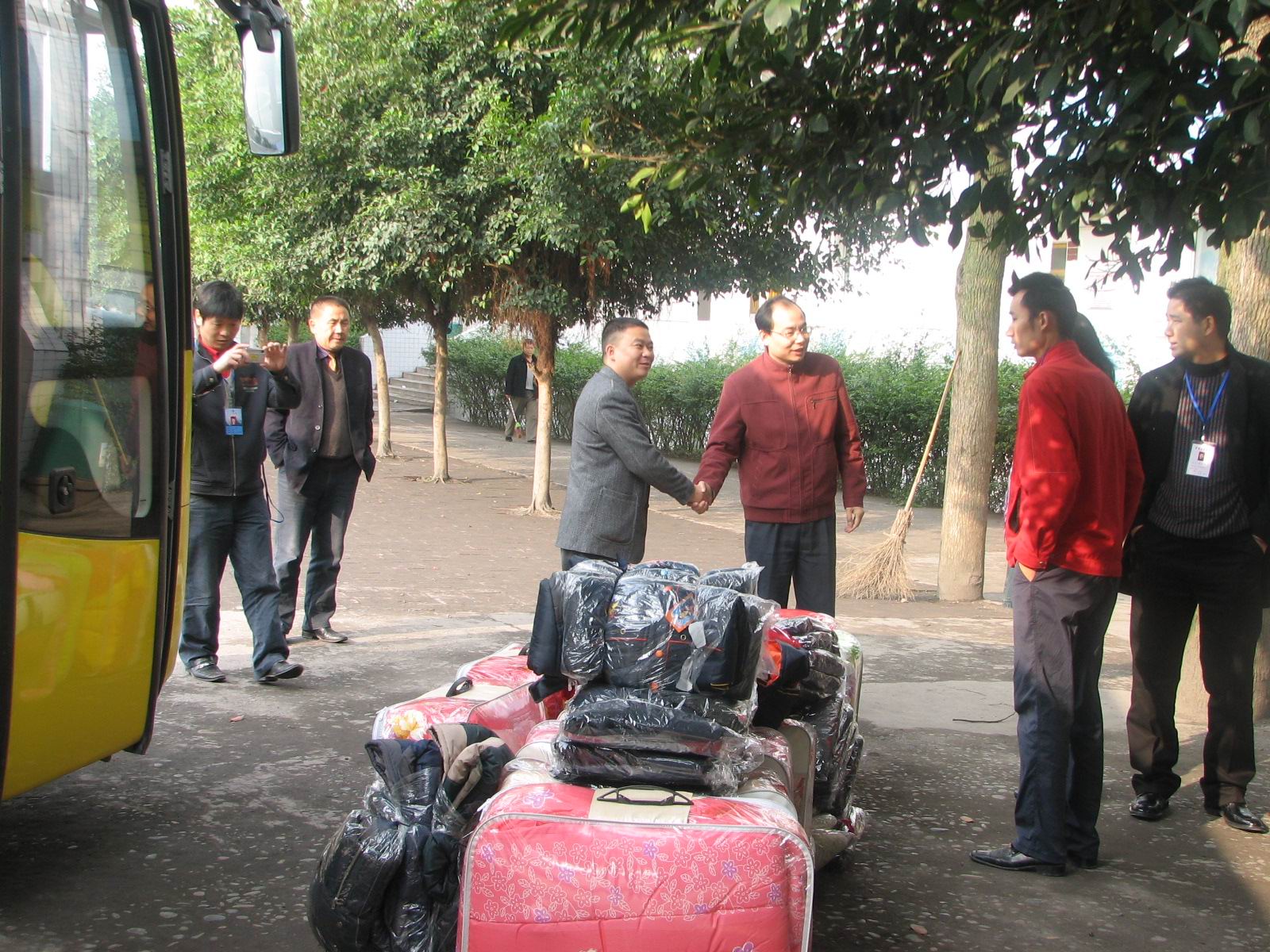 11月23日,泸州高中办公室主任罗德强在市教育局基础教育科副科长向容的带领下,给寄住在泸州十中的地震灾区师生们送去崭新的衣被。