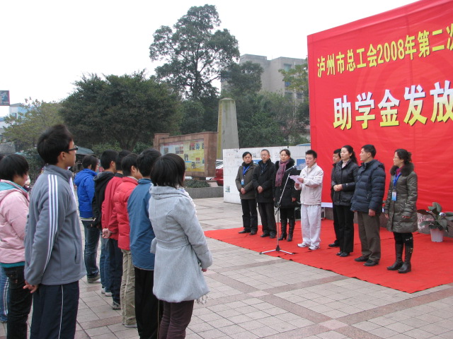 12月26日,泸州市总工会举行2008年第二次“金秋助学”助学金发放仪式,泸州高中20名贫困学生每人获助学金1000元。